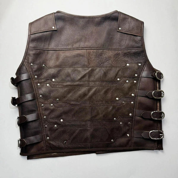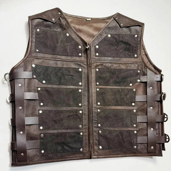 - Inspired by Aaron Taylor-Johnson’s fierce portrayal of Kraven the Hunter, this vest features a rugged, collarless V-neck silhouette and an earthy brown finish for a truly iconic aesthetic.