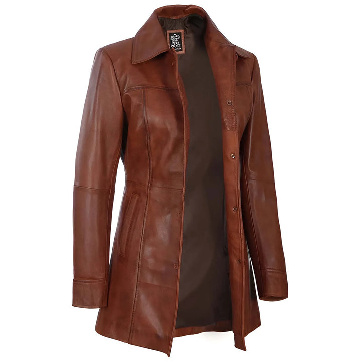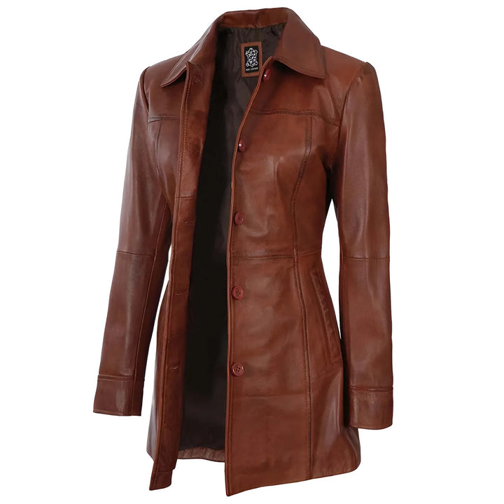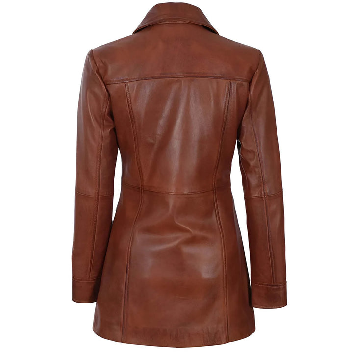 Elegant Kandis Cognac Brown Leather Car Coat for Tall Women (5'9"-6'0"). Crafted from lambskin leather with a soft polyester lining for warmth and comfort. Features a classic 5-button closure, decorative seams, and multiple pockets for convenience. Perfect for travel and outdoor wear, this coat adds timeless style to any outfit. Explore our Women Brown Cognac Leather Blazer in our collection.