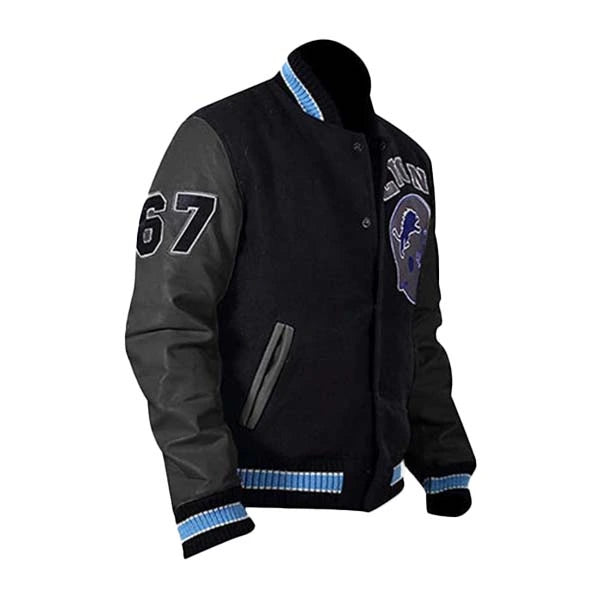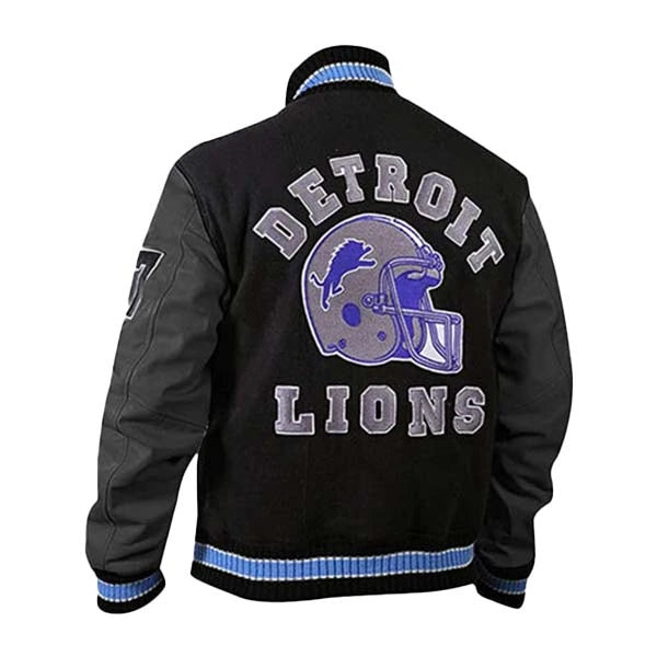 - Furthermore, the jacket features the iconic Detroit Lions logo on the chest and sporty patchwork throughout. This detail connects you directly to the movie and NFL fandom.