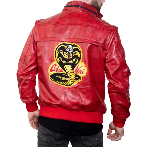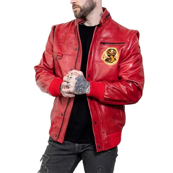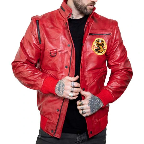 - Firstly, this iconic Johnny Lawrence Cobra Kai jacket is crafted from 100% premium genuine red leather. Moreover, the leather has a smooth and durable texture, providing both a bold look and lasting comfort.
