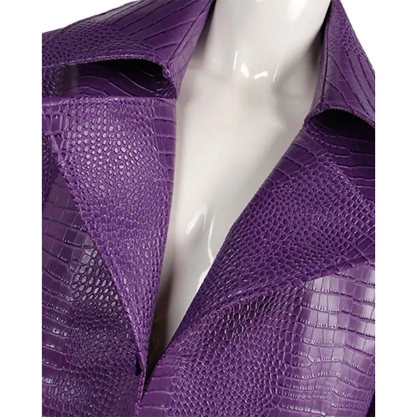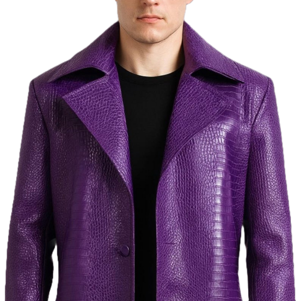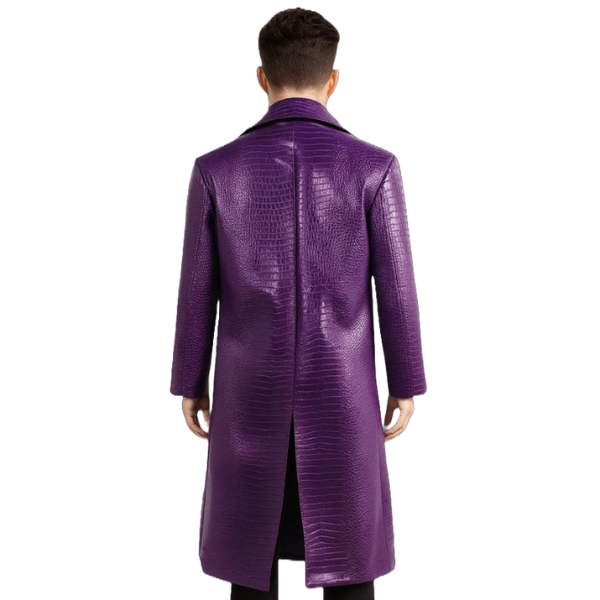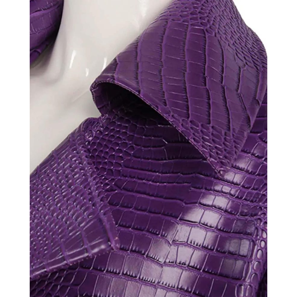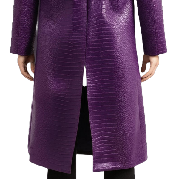 - First, this trench coat features a striking crocodile leather texture in a vivid purple shade. Moreover, the unique pattern adds a luxurious and edgy feel that truly stands out.