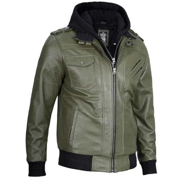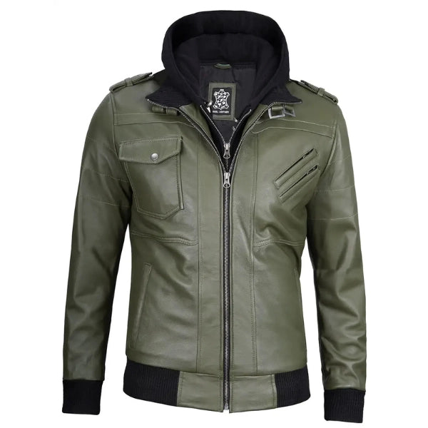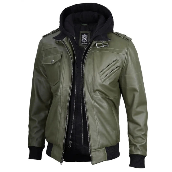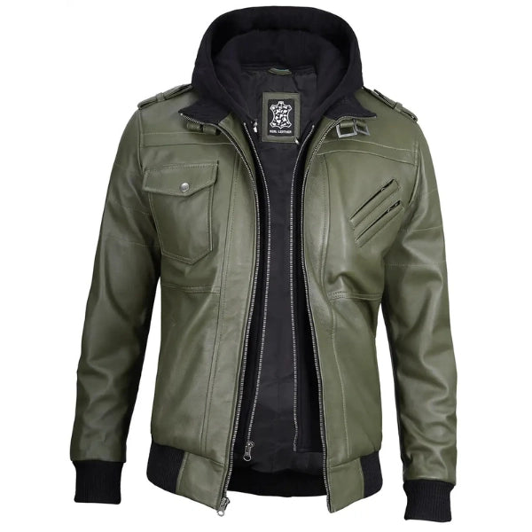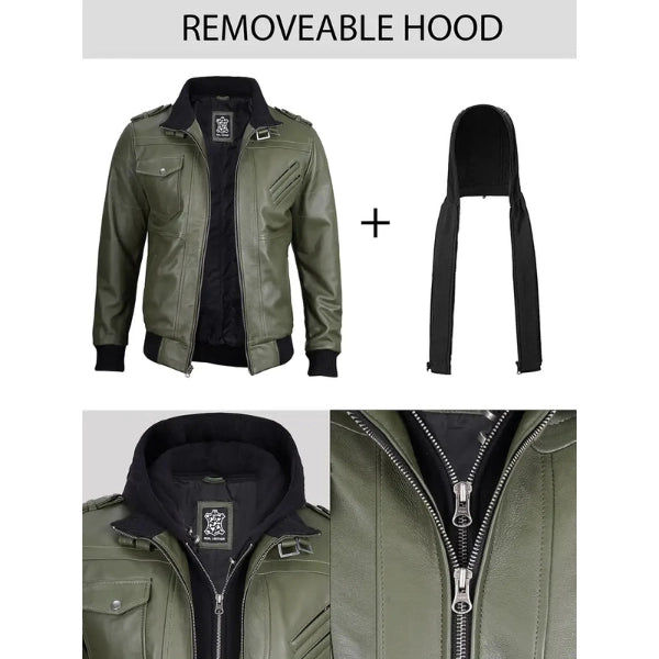 - First, this bomber jacket features rich Green Sheep leather for a classic look. Moreover, the removable hood adds flexibility, allowing you to customize your style.