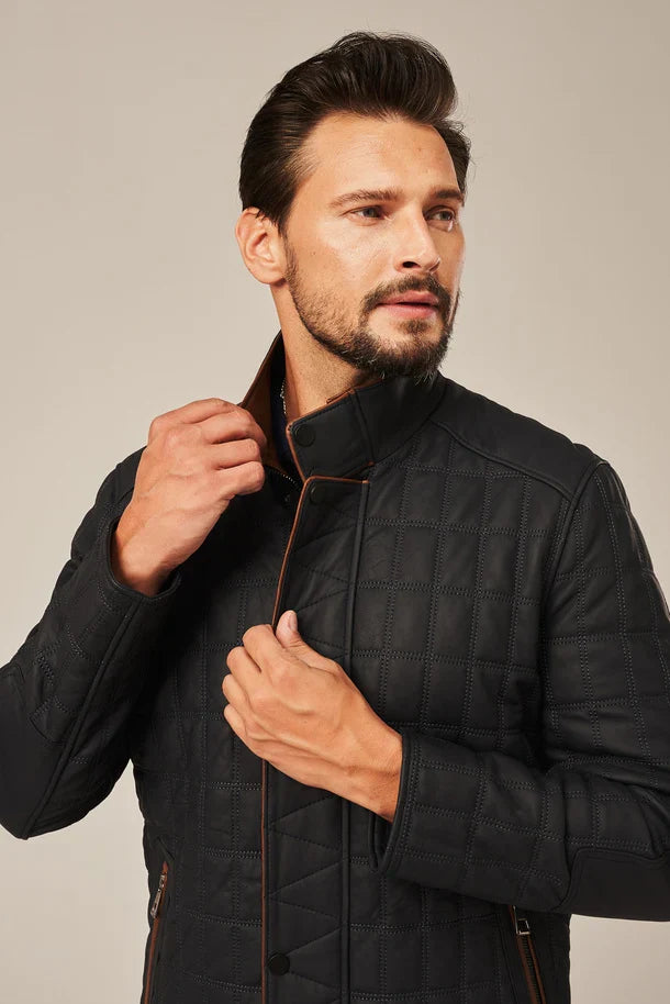 Crafted from premium sheepskin leather, this men's quilted jacket combines timeless style with everyday functionality. The structured regular fit features distinctive quilted panel detailing that adds visual interest and dimension. A soft viscose lining ensures comfort against the skin, while the dual-closure system front zipper with snap button provides secure fastening. Three strategically placed pockets keep essentials within reach. Perfect for layering or wearing solo, this versatile black jacket transitions seamlessly from casual outings to weekend adventures.