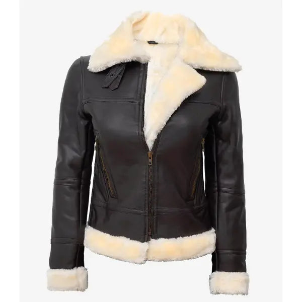 Women Dark Brown Leather Bomber Shearling Jacket