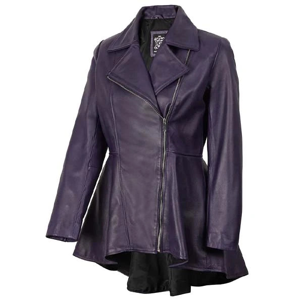 - Expertly crafted from 100% genuine purple leather, our Women Purple Peplum Motorcycle Leather Jacket promises unmatched softness, exceptional durability, and lasting vibrancy.